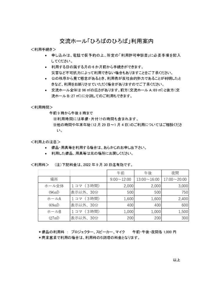 10月のリニューアル後、講演会、音楽会など多目的に利用できる交流ホール「ひろばのひろば」も多くの方にお使いいただいています。10月時点で12月までの利用料をお知らせいたしましたが、このほど、12月までの利用料を来年9月30日まで延長させていただくことになりました。「ひろばのひろば」、ご利用ください。