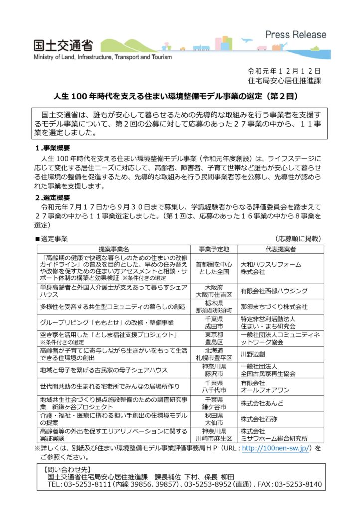 「人生100年時代を支える住まい環境整備モデル事業」に採択されました