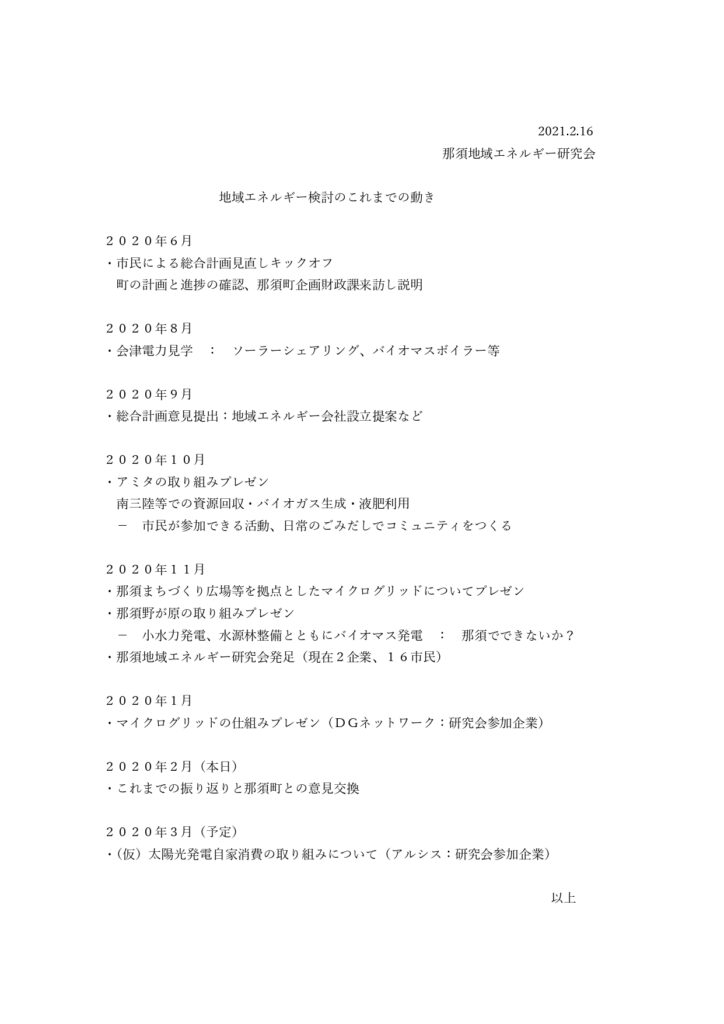 ニュース 「地域発のエネルギーを考える」その4を開催しました 2021/02/19募集中! Tweet 16日(火)、那須広場塾「地域発のエネルギーを考える」(その4)を開催しました。行政職員、議員も参加し充実の話し合いでした。画像はこれまで活動内容をまとめたものです(3月は予定)。このような研究会に関心がおありの方はご一報ください。地域発のエネルギーをいっしょにつくる方、大歓迎です。