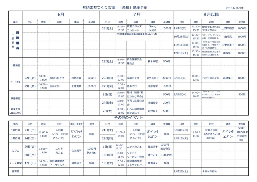 ニュース 「楽校(がっこう)」の予定です 2018/06/19記事 Tweet 6月後半以降の楽校の予定を掲載しました。チラシ作成後もイベント追加になっています。facebookもチェックいただくようお願いします。