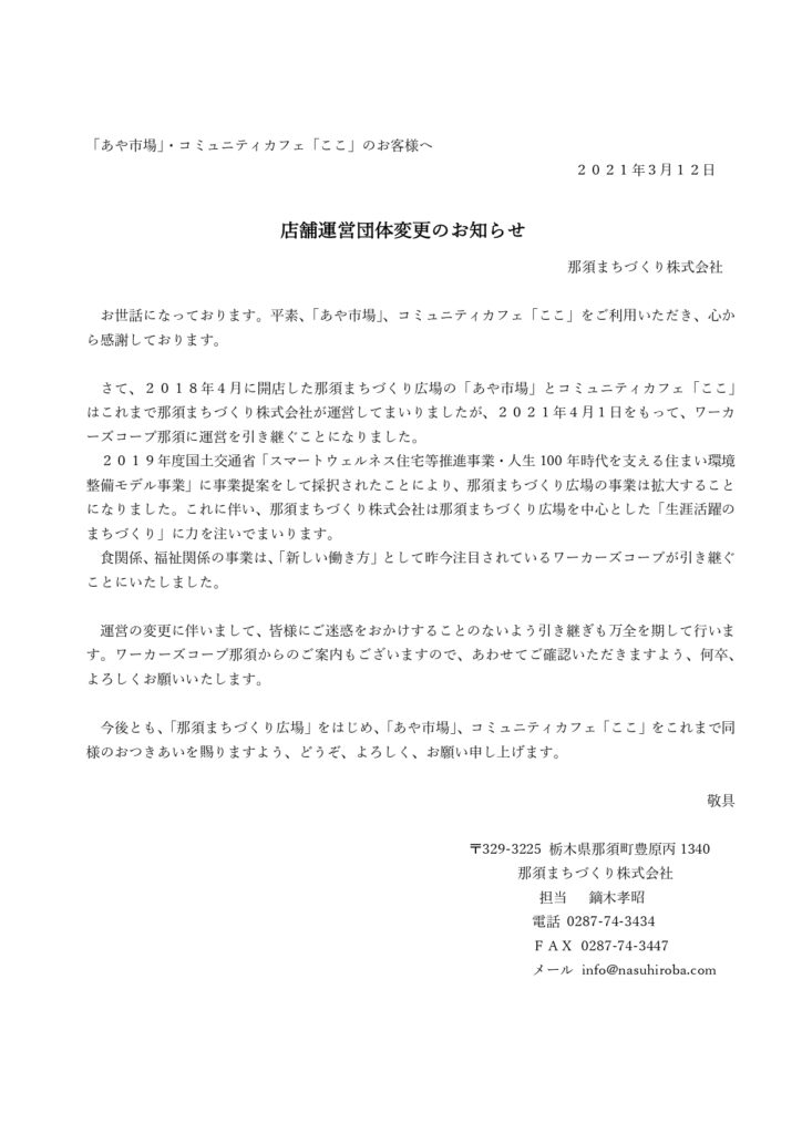 ニュース カフェと市場の運営団体が変更になります 2021/03/12カフェ Tweet 来月4月からあや市場とコミュニティカフェ「ここ」の運営は那須まちづくり株式会社からNPO法人ワーカーズコープに変更になります。運営の変更で皆様にご迷惑をおかけしないよう引き継ぎには万全を期しております。今後とも、あや市場とコミュニティカフェ「ここ」とおつきあいを賜りますよう、どうぞ、よろしく、お願いいたします。