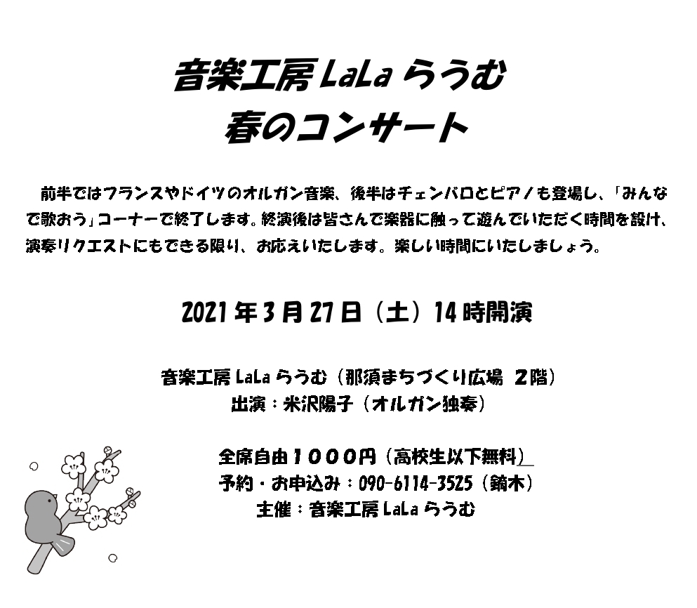 ニュース 音楽工房LaLaらうむ、春のコンサートのお知らせ 2021/02/28音楽会 Tweet 音楽工房LaLaらうむは3月27日に春のコンサートを開催します。美しいパイプオルガンの音色を聴きにいらっしゃいませんか? LaLaらうむでお待ちしています。