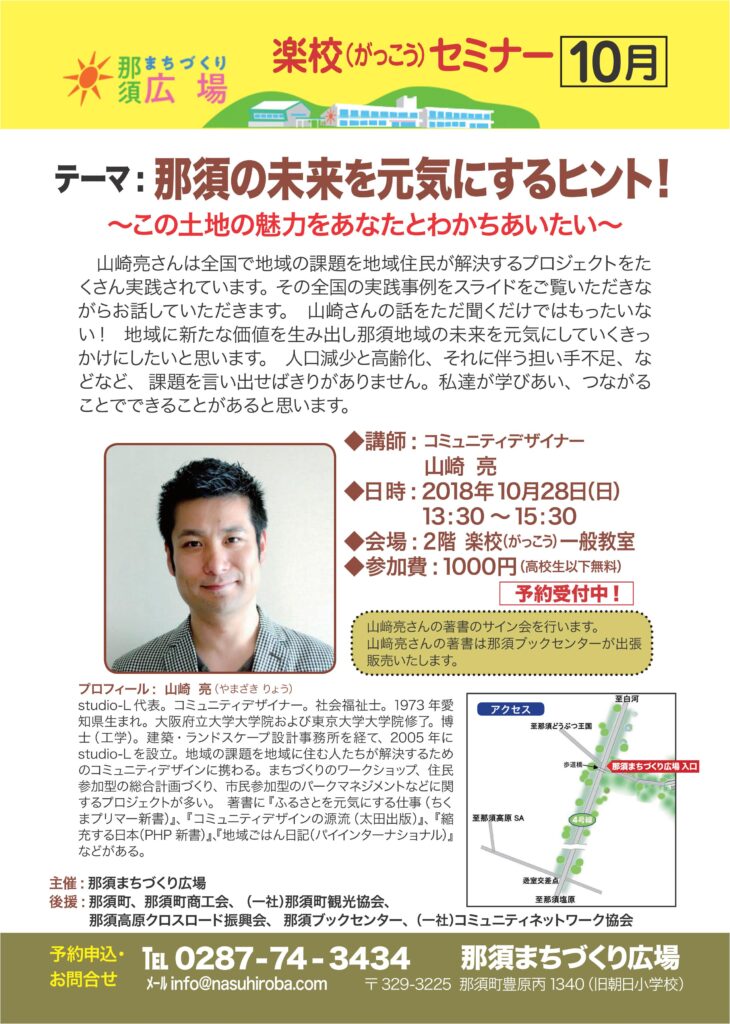 ニュース 10月の招聘講座は山崎亮さん登壇です! 2018/09/28セミナー Tweet 10月28日、地域コミュニティづくりで有名な山崎亮さんを招聘し、「那須の未来を元気にするヒント」というテーマで講演をいただきます。貴重な機会です、多くのみなさまの参加、お待ち申し上げております。