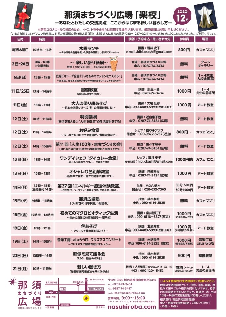 ニュース 12月の催し物一覧表 2020/11/19イベント Tweet 那須まちづくり広場、12月の催し物一覧表のご案内です。 ぜひご一読ください。 新型コロナウィルスの感染拡大に伴い、イベントは中止または延期の可能性があります。 最新情報は問い合わせ先にご確認ください。