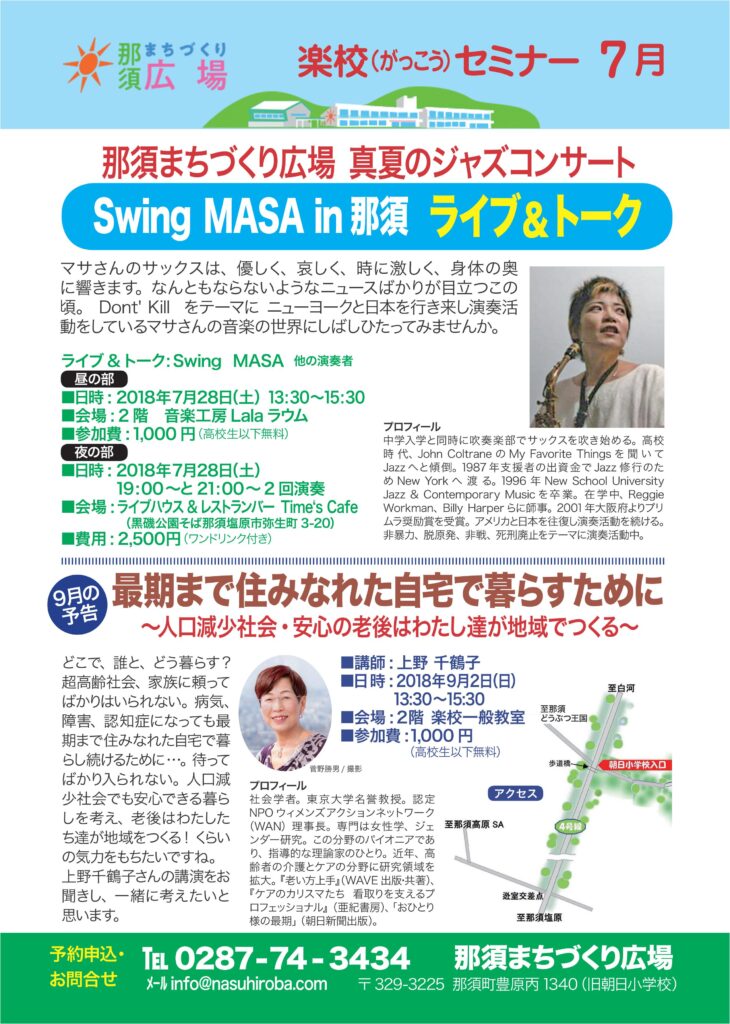 ニュース 7月と9月の招聘講演です 2018/06/19セミナー Tweet 7月招聘講演のチラシができました、7月はSwing MASAさんの「真夏のジャズコンサート」です。ぜひ堪能していただきたいと思っております。9月は上野千鶴子さん登壇、「最期まで住みなれた自宅で暮らすために」との演題でお話しいただきます。お楽しみに!