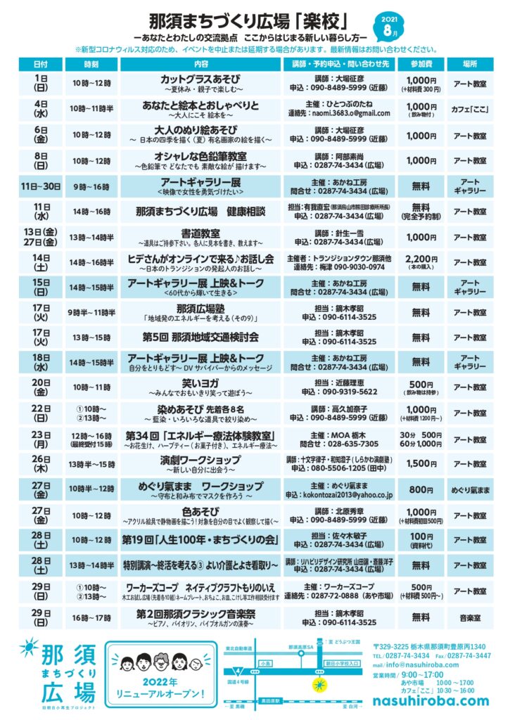 ニュース 8月の催し物一覧表 2021/07/10イベント Tweet 那須まちづくり広場、8月の催し物一覧表のご案内です。 新型コロナウィルスの感染拡大に伴い、イベントは中止または延期の可能性があります。 最新情報は問い合わせ先にご確認ください。 8月17日の那須地域交通検討会は中止になりました。