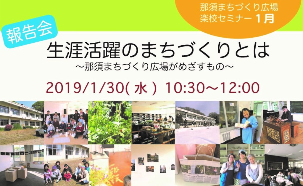 1⽉は年始の催しとして那須まちづくり広場でのこれまでの活動を振り返る、報告会を開催したいと思っております。朝⽇⼩学校跡地を「⽣涯活躍のまち」の学びを実践、仕事と新しいコミュニティーの場にしたいと思い、始めた「まちづくり広場」の活動。お陰様で様々な⽅にご参加、ご協⼒いただき様々な学びと実践の活動が展開されています。