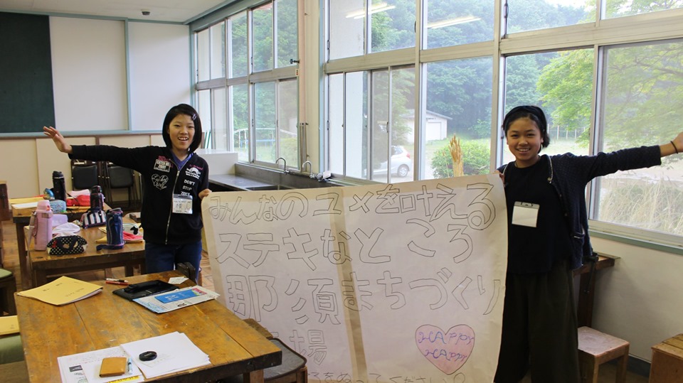 写真の女の子二人は広場をもっと楽しくしたい、多くの人に広めたいということで子供用パンフレットを作ってくれます。今回はそれにさきがけて、那須まちづくり広場の名前を書いた、大きな塗り絵を作ってきてくれました。 昇降口に飾ってありますので、ぜひお気に入りの画材をご持参いただいて塗り絵を楽しんでください。 子どもたちが学校の先生や広場の大人たちのサポートを受けながら、自分たちの力で作っていく会社づくり。今後の活躍が楽しみです!