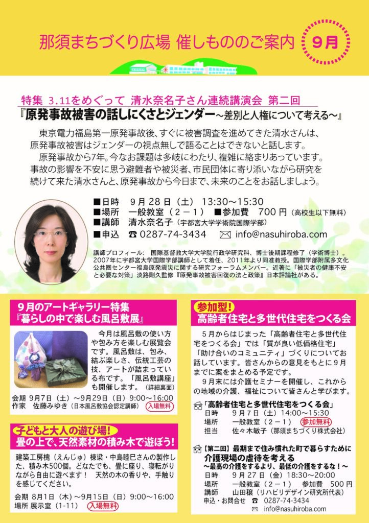 ニュース 9月の特集記事のご案内 2019/08/27イベント Tweet 広報からのお知らせです。 那須まちづくり広場9月の催し物のパンフレットが完成しました。 今回の特集は8月に引き続き宇都宮大学国際学部准教授、清水奈名子さんの連続講座、 住宅づくりの会、アートギャラリー特集「暮らしの中でたのしむふろしき」展です。 清水先生の講座についてはこちらを 高齢者住宅と多世代住宅をつくる会についてはこちらをご覧ください。 那須まちづくり広場最多のイベント数となった9月の催し物一覧はこちらをご覧ください。