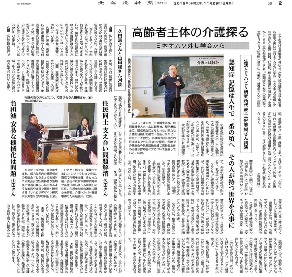 ニュース 北海道新聞掲載のお知らせ 2019/11/30記事 Tweet 新聞掲載のお知らせです。 2019年11月29日付の北海道新聞夕刊にて、那須まちづくり広場で開催された「第10回日本オムツ外し学会」について取り上げていただきました。 『高齢者主体の介護探る』ぜひご覧ください。