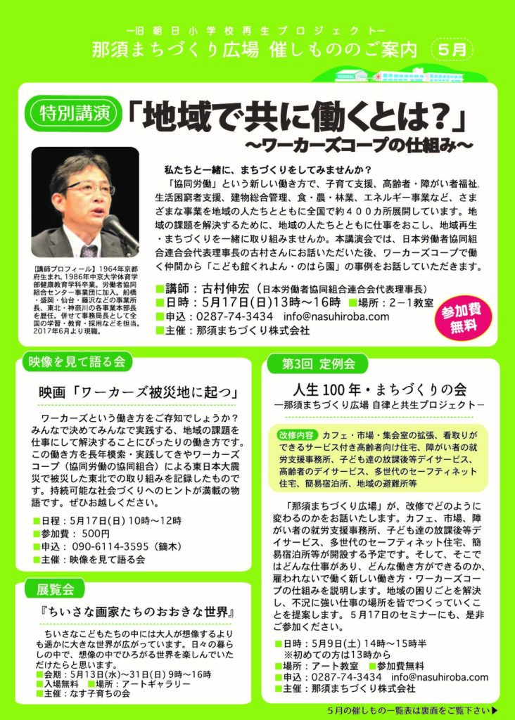 那須まちづくり広場、5月の催し物特集のご案内です。 ぜひご一読ください。