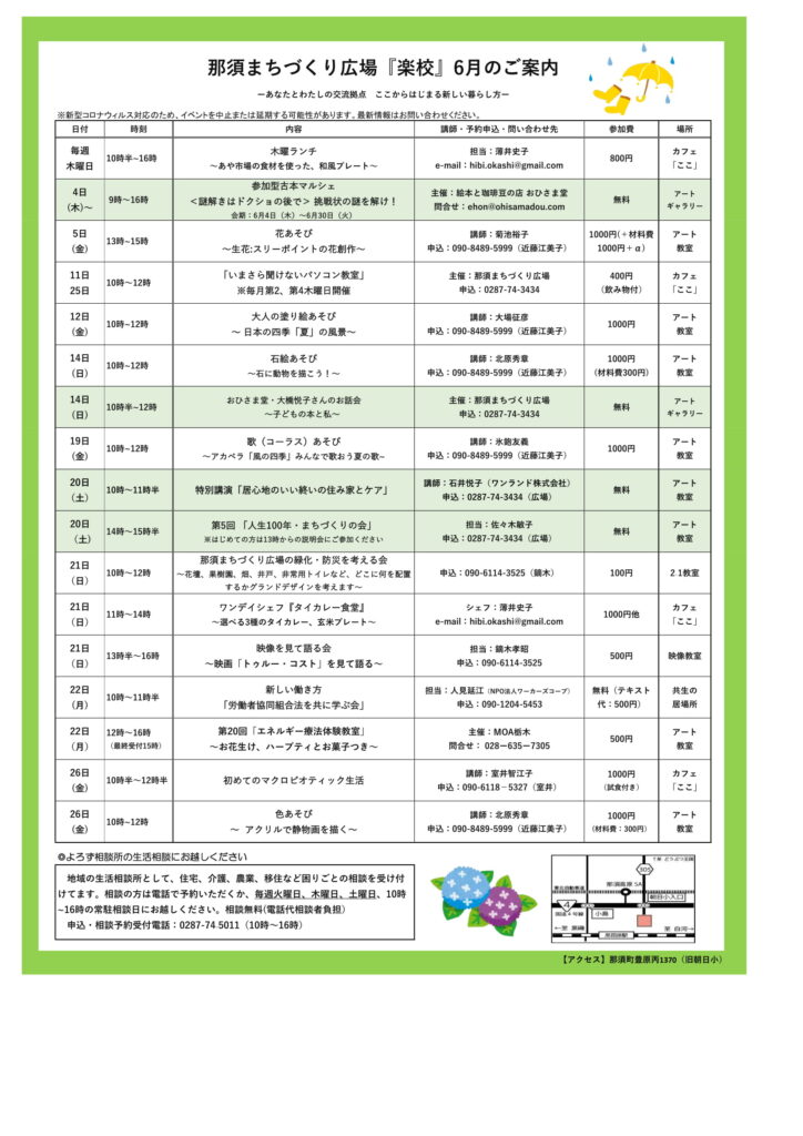 ニュース 6月の催し物一覧表 2020/04/21イベント Tweet 那須まちづくり広場、6月の催し物一覧表のご案内です。 ぜひご一読ください。 新型コロナウィルスの感染拡大に伴い、イベントは中止または延期の可能性があります。 最新情報は問い合わせ先にご確認ください。