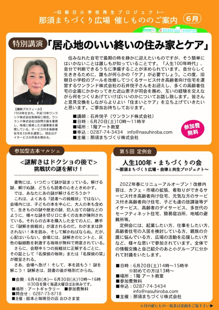 ニュース 6月の催し物特集 2020/04/21記事 Tweet 那須まちづくり広場、6月の催し物特集のご案内です。 ぜひご一読ください。 新型コロナウィルスの感染拡大に伴い、イベントは中止または延期の可能性があります。 最新情報は問い合わせ先にご確認ください。