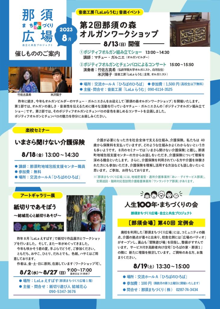 | 第2回 那須の森オルガンワークショップ | 日付:8月13日(日) | 時間:➀13:00~ ポジティフオルガン組み立てショー ➁15:00~ オルガンとチェンバロによるコンサート | 講師:①マチュー・ガルニエ ➁竹佐古真希、米沢陽子 | 申込:音楽工房 LaLa らうむ 090-6114-3525 | 参加費:1500円 | 場所:音楽工房 LaLa らうむ | 詳細(備考): |