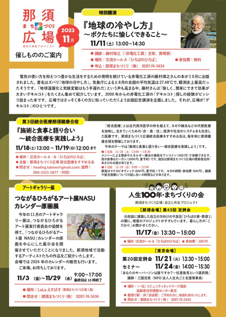 | 『地球の冷やし方』 ~ボクたちに愉しくできること~ | 日付:11月11日(土) | 時間:13:00~14:30 | 講師:藤村靖之(「非電化工房」主宰、発明家) | 申込:那須まちづくり(株) 0287-74-3434 | 参加費:無料 | 場所:那須まちづくり広場 交流ホールA | 詳細(備考):「地球の冷やし方」の出版記念講演。「愉しく、簡単にできて効果が 大きいデキルコト」を多く紹介します。 |