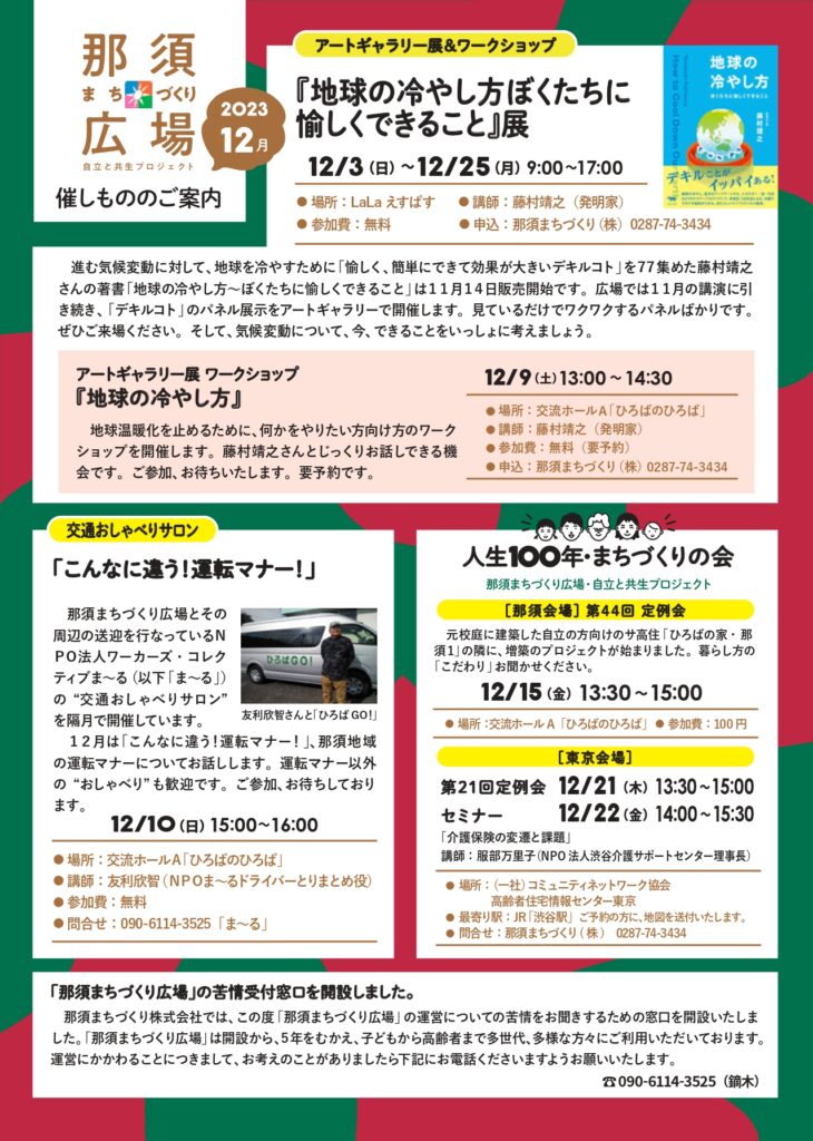 | 『地球の冷やし方ぼくたちに 愉しくできること』展 | 日付:12/3(日) ~ 12/25(月) | 時間:9:00~17:00 | 講師: | 申込: | 参加費:無料 | 場所:LaLa えすぱす (アートギャラリー) | 詳細(備考):地球を冷やすために「愉しく、簡単にできて効果が大きいデキルコト」をパネルにしたものを展示します |