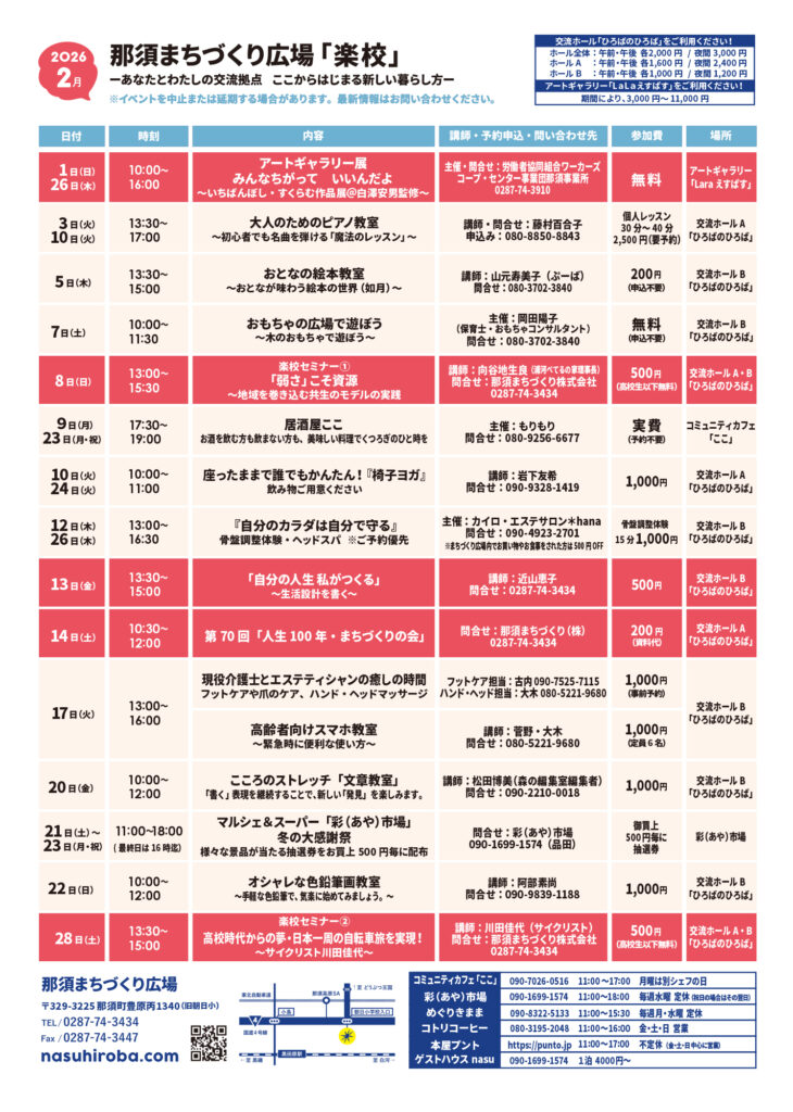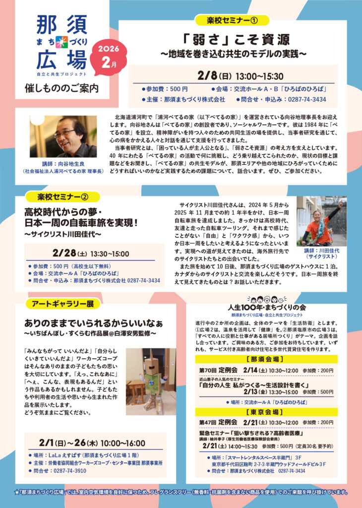 | 「弱さ」こそ資源 ~地域を巻き込む共生のモデルの実践~ | 日付:2/8(日) | 時間:13:00~15:30 | 講師:向谷地生良(社会福祉法人浦河べてるの家 理事長) | 申込:那須まちづくり株式会社 0287-74-3434 | 参加費:500 円 | 場所:交流ホールA・B「ひろばのひろば」 | 詳細(備考): |