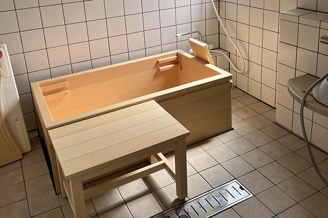 香り豊かなヒノキの風呂は、桶と介助の工夫によって実現。